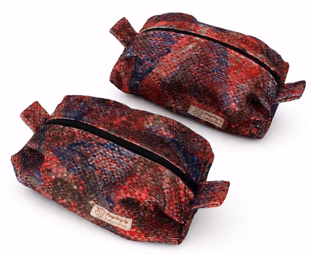 Upptäck en necessär som är mer än bara praktisk – den är ett litet konstverk. Varje väska är noggrant handsydd av tyg med unikt handtryck, vilket gör varje exemplar helt unikt.