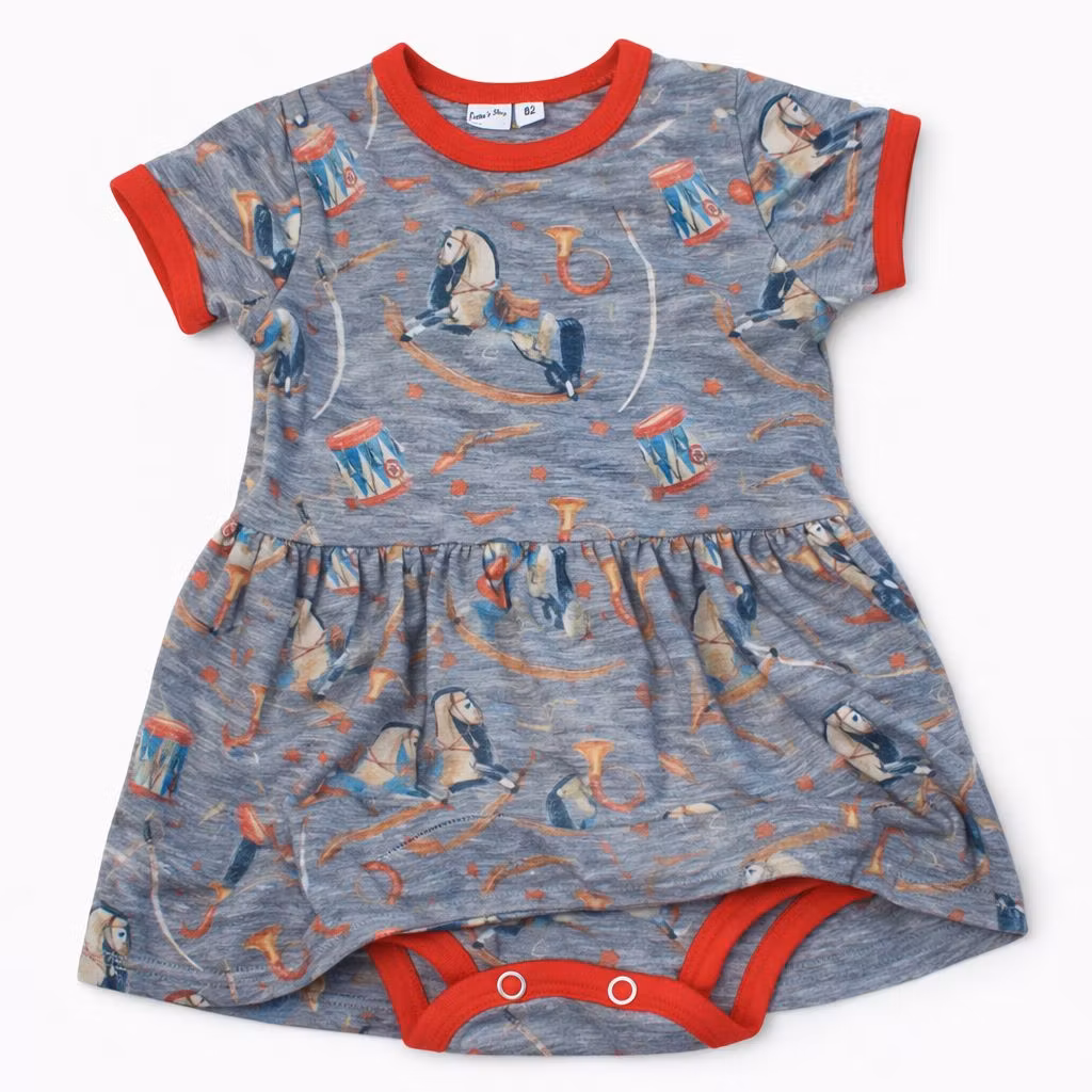 Charmig bodyklänning med lekfullt gunghästmotiv, sydd i mjuk och följsam ekologisk jersey/trikå som är skonsam mot barnets hud. Bodydelen håller plagget på plats samtidigt som kjolen ger en söt och lekfull känsla.