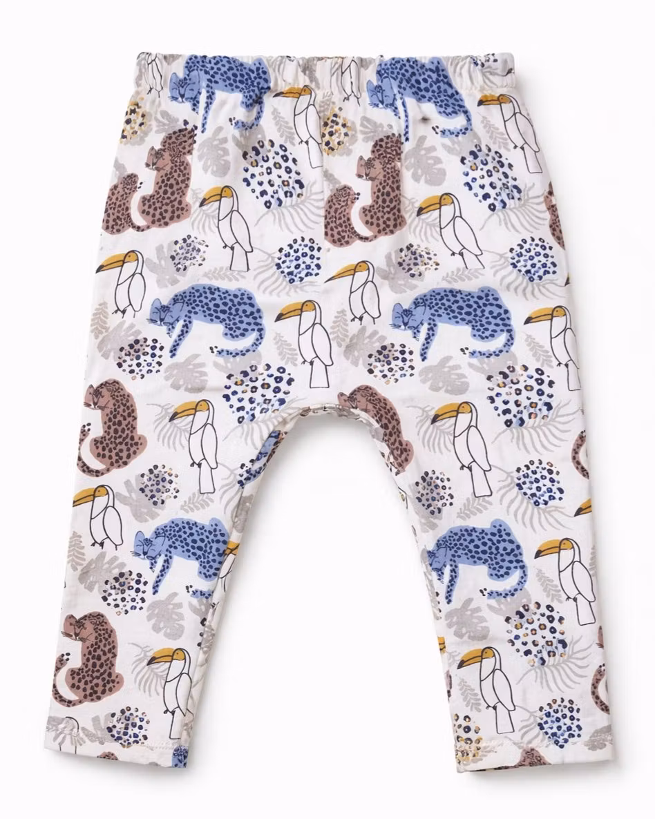 Lätta och bekväma byxor med motiv av exotiska djur, sydda i mjuk och sval ekologisk muslin. Det luftiga tyget gör byxorna perfekta för varmare dagar samtidigt som resåren i midjan ger en skön och flexibel passform.