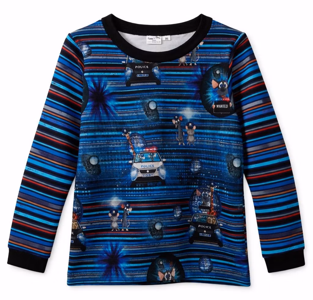 Långärmad barntröja med randiga ärmar och motiv av möss på polisuppdrag på fram- och bakstycket. Tröjan är sydd i en mjuk och bekväm ekologisk OEKO-TEX / GOTS-certifierad French Terry, vilket gör den perfekt för både lek och vardag.