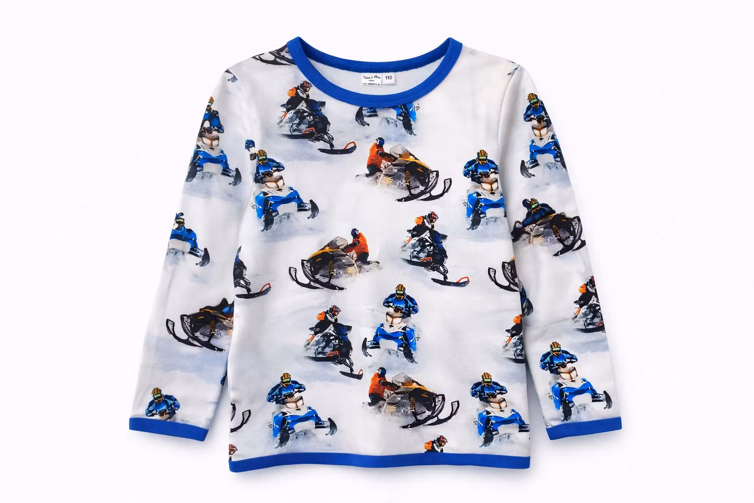 Barntröja med snöskotermotiv, sydd i en mjuk och bekväm ekologisk OEKO-TEX / GOTS-certifierad jersey/trikå. Perfekt för lek, vardag och alla små som gillar fartfyllda vinteräventyr.