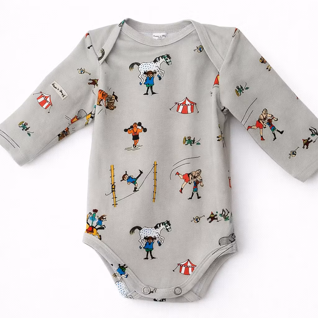 Upptäck en unik ekologisk babybody med cirkusmotiv från Catta's Shop. Babybodyn En dag på cirkus kombinerar lekfull design, hög komfort och hållbar produktion – perfekt för små upptäckare.