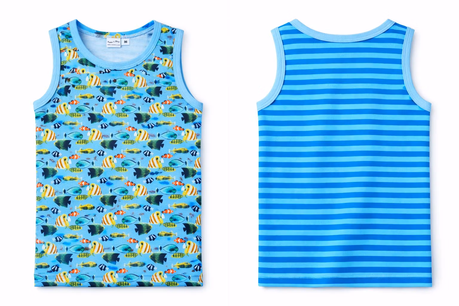 Upptäck vårt ekologiska linne med fiskmotiv, ett mjukt och bekvämt plagg som kombinerar stil, komfort och hållbara material. Linnet har ett lekfullt fiskmotiv på framsidan och en randig baksida, vilket ger ett personligt och unikt uttryck.