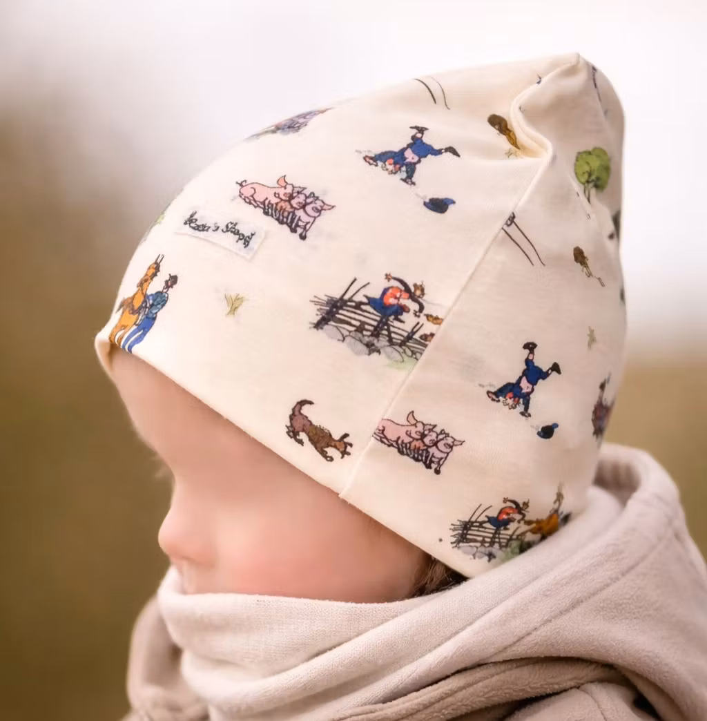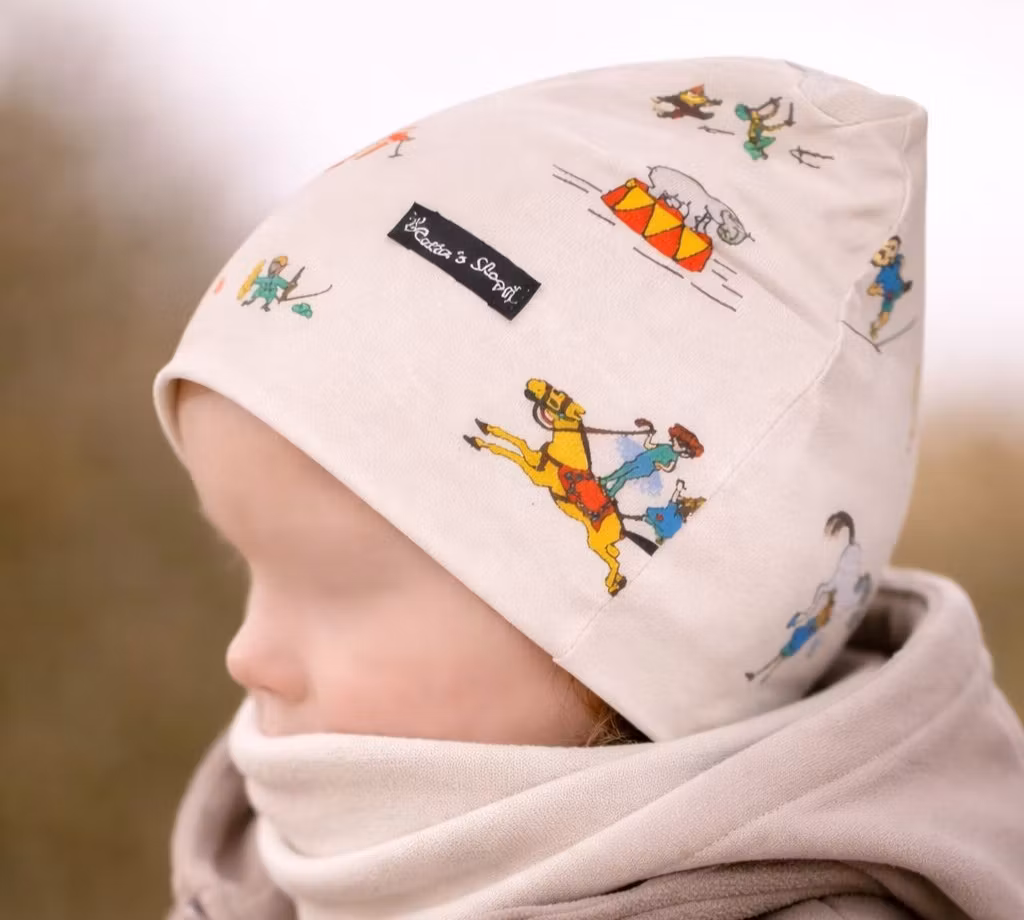 Varje mössa är unik. Motiven är medvetet inte mönsteranpassade – ett aktivt val för att minska tygspill och värna om våra resurser.